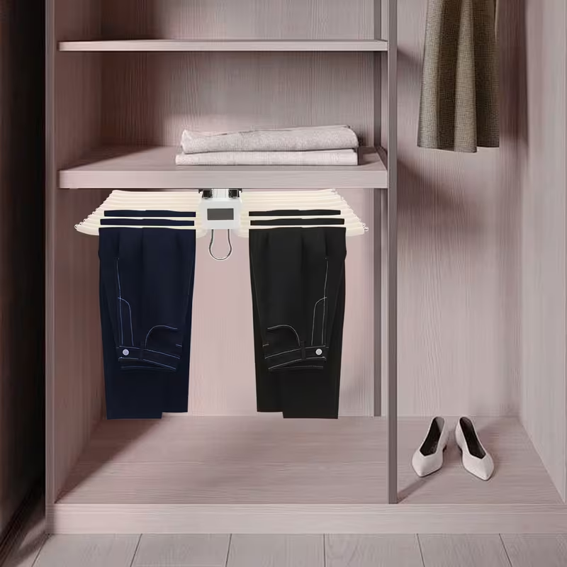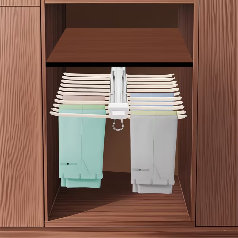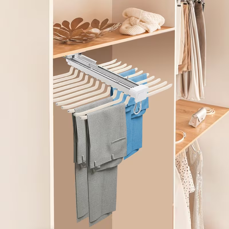 The rack remains compact when closed. The extendable mechanism allows space to be used gradually. This suits different wardrobe sizes. The interior remains visually balanced.